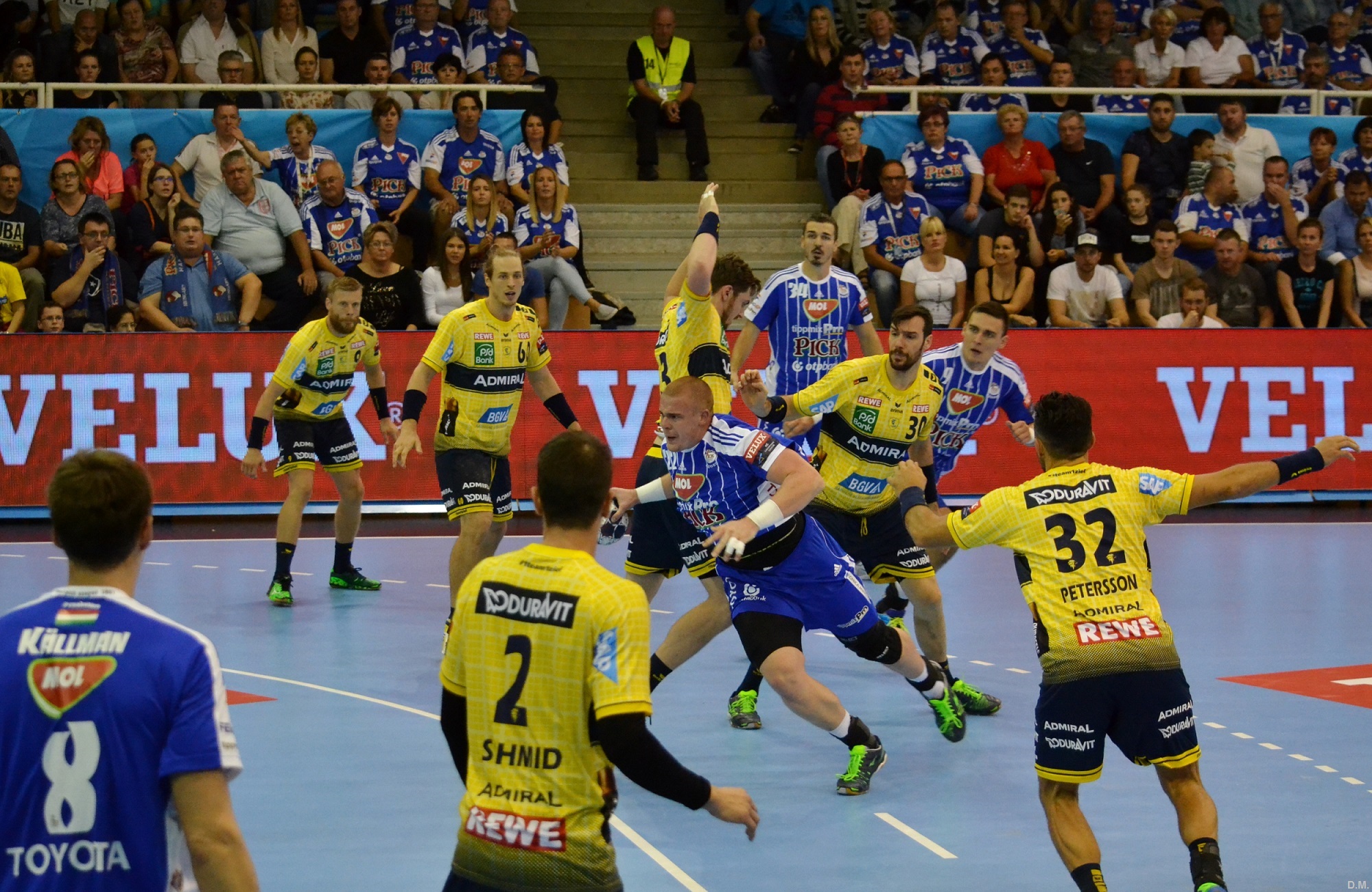 La rencontre a démarré avec un jeu à deux pivots de part et d’autres laissant plus d’espaces aux arrières qui ont été les seuls à marquer dans les toutes premières minutes. Ensuite, les actions se sont variées et les Löwen ont accéléré le tempo avec des engagements et des passes rapides face à une équipe de Szeged plus lente et laborieuse. Les attaques allemandes se sont régulièrement terminées sur l’aile droite avec Gudjon Valur Sigurdsson, arrivé cet été au club. Juan Carlos Pastor a dû demandé un temps mort dès le premier quart d’heure lorsque les visiteurs menaient de quatre longueurs (5–9). Les visiteurs ont fait le choix d’attaquer avec sept joueurs de champ en faisant donc sortir le gardien. Cela aurait pu leur coûter plusieurs buts mais les situations avec la cage vide ont été mal négociées par les joueurs de Szeged. Concernant les portiers justement, Andreas Palicka a eu son moment fort dans la première partie de la période et Marin Sego, arrivé de Plock, s’est à son tour illustré en fin de mi-temps. Szeged a ainsi réalisé une série de 6-1 pour reprendre l’avantage (11–10) grâce d’ailleurs au premier but en Ligue des champions du jeune Richárd Bodó. Pour les Rhein-Neckar Löwen, seul Andy Schmid a réussi à se détacher sur la base arrière en tandis que chez les locaux, les nombreuses rotations ont permis à cinq joueurs d’inscrire leur nom sur la liste des buteurs. A la pause, le Mol-Pick Szeged menait donc d’un but : 13–12.