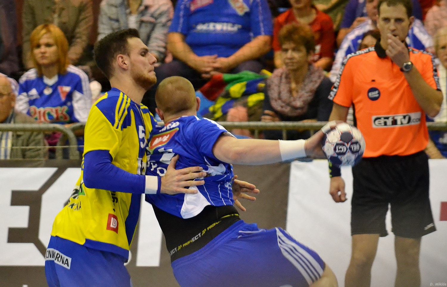 Le début de match a été très riche en buts (10e : 5–5) avec Celje marquant plutôt sur des phases rapides à l’inverse de Szeged qui a inscrit ses buts sur des attaques placées. Le jeu avec les pivots de Szeged a très bien fonctionné tout au long de la partie, ainsi que la rentrée de Jonas Källman (6 buts) au centre. Les passes des arrières pour Bence Bánhidi puis Matej Gaber ont coup sur coup porté leurs fruits avec un but ou un penalty obtenu. Les deux équipes ont raté assez peu de tirs tandis que les gardiens n’ont jusque très longtemps pas réussi d’arrêts. Ce n’est qu’après le premier quart d’heure que Szeged est parvenu à se détacher en resserrant la défense – Marin Sego a d’ailleurs effectué ses premières parades – ainsi que sous l’impulsion de Stas Skube (5 buts) et de ses un contre un (20e : 12–8). Les joueurs de Celje ont ensuite bâclé leurs attaques et perdu consécutivement des ballons, offrant ainsi des contre-attaques à Szeged. Le portier slovène Ivan Gajic s’est en revanche remarquablement illustré en remportant plusieurs face à face, notamment des penaltys. Malgré cela, les Slovènes sont restés à distance, la faute à des attaques plus laborieuses et bien moins fructueuses qu’au début du match. Seuls Ziga Mlakar et l’ancien joueur de Montpellier Borut Mackovsek ont réellement inquiété Szeged en attaque, marquant à eux deux sept des dix buts de Celje en première période. C’est donc avec leur plus gros avantage que les Hongrois sont rentrés aux vestiaires (15–10).