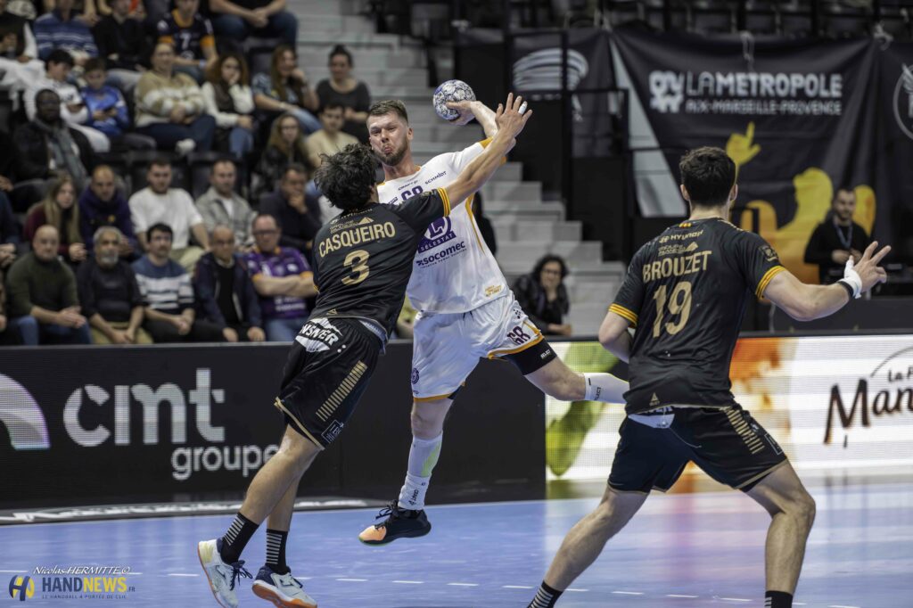 Il faut alors un coup de pouce du gardien Joze Baznik, auteur d’un triple arrêt, pour permettre aux Aixois d’accélérer et de prendre les commandes à la pause (16-15). Fidèles à ce qu’ils proposent depuis le début de la saison, les hommes de Laurent Busselier jouent sans complexe et s’accrochent encore en seconde période (24-22, 45’).