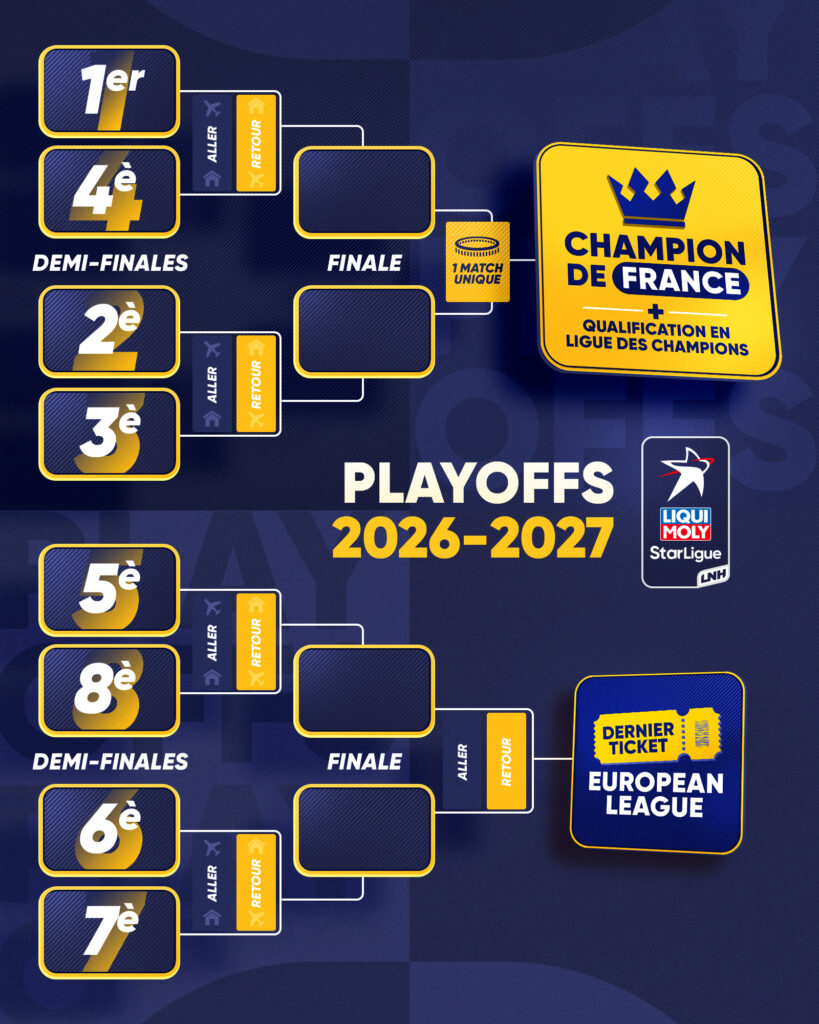 Les quatre premiers du classement se disputeront le titre de Champion de France. Les demi-finales se joueront en aller-retour (1er contre 4e, 2e contre 3e), avec un match retour chez l’équipe la mieux classée. La finale, disputée sur un match, sacrera le champion de France et offrira une qualification directe pour la Ligue des Champions. En cas d’égalité, une séance de jets de 7 mètres départagera les équipes. Comme c’est déjà le cas, de nouvelles places pourraient être attribuées dans la compétition reine. Si l’EHF en accorde une ou deux supplémentaires, elles reviendraient aux équipes les mieux classées à l’issue de la saison régulière, en commençant par celle qui n’a pas remporté les play-offs. Ainsi, si le vainqueur des play-offs est différent du premier de la saison régulière, ce dernier pourrait bénéficier de ces places supplémentaires.